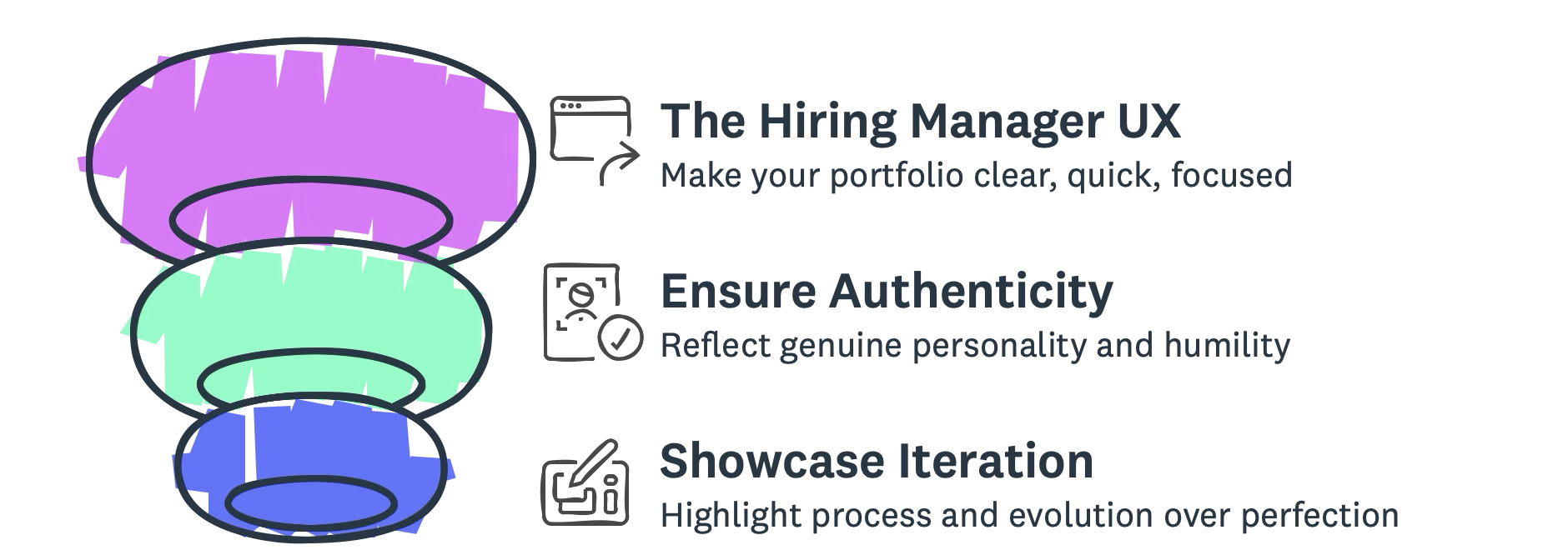 Learn, Not Perfect: If your portfolio only shows polished final screens, it can come across as disconnected from real-world problem-solving. Embrace your mistakes and your learning process.